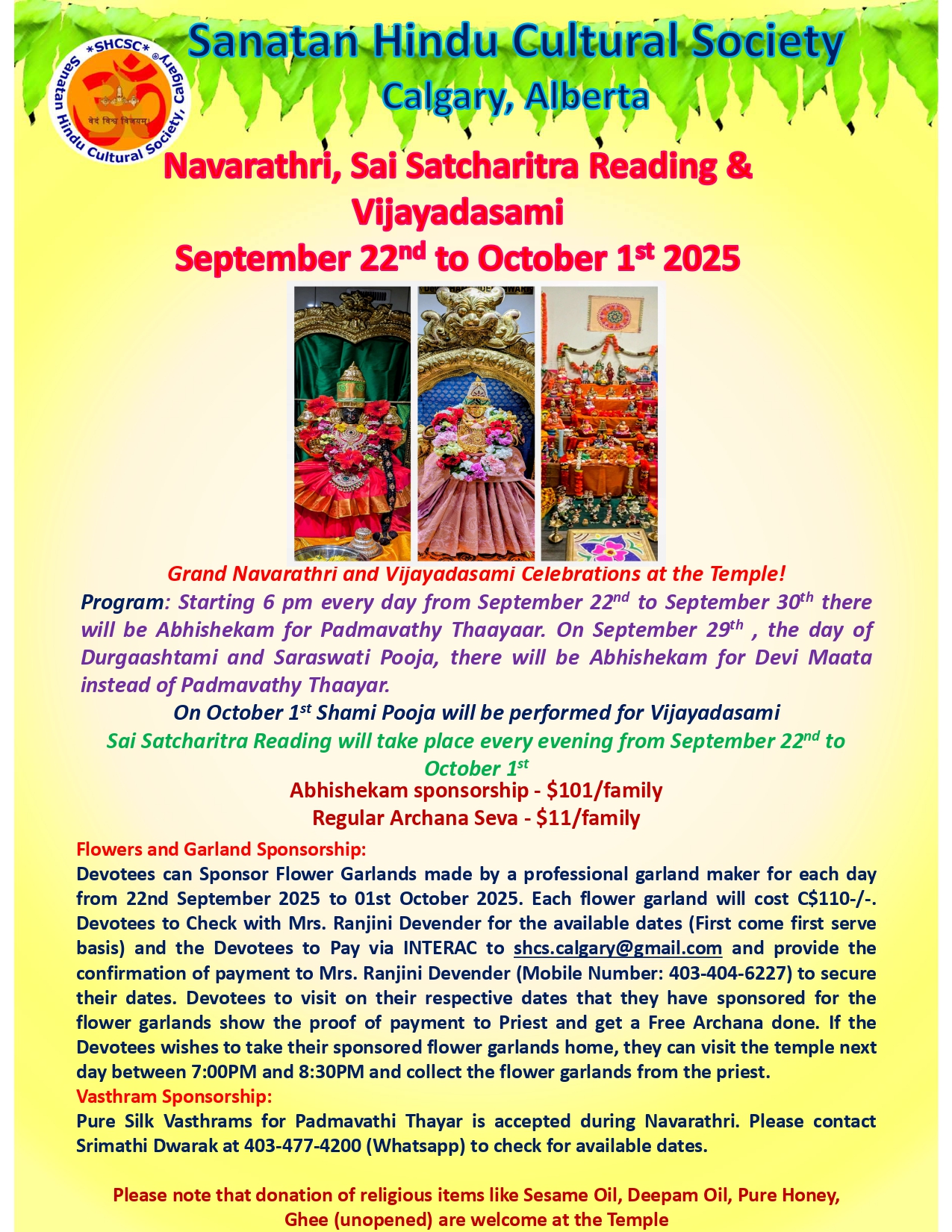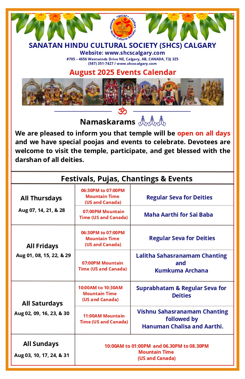 Please pay for the Sevas you want to perform on Rudra Homam day via e-transfer to shcs.calgary@gmail.com stating the type of Seva. For garlands please message Ranjini Devender at 403 404 6227. After payment if you are not attend in person please send your family star details to Rajkumar Panditji at 403 559 4590 and he will do the needful.